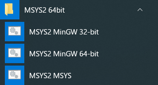 インストールした MSYS2 では、スタートメニューに、MinGW 32bit, MinGW 64bit そして MSYS の三種類の端末エミュレータが登録されていて、どれを使うべきなのか戸惑います。