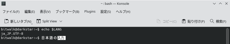 再起動後、端末エミュレータ Konsole を起動して、念のため、環境変数 LANG が ja_JP.UTF-8 に設定されていることを確認します。つづけて Ctrl + SPACE で fcitx の入力に切り替わり、ローマ字打ちで日本語入力ができることを確認します。