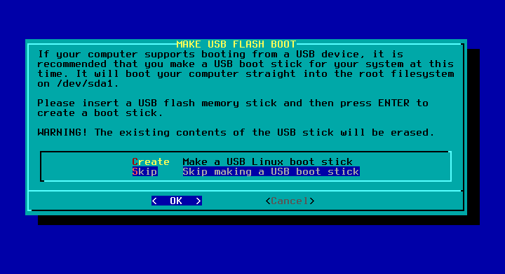 USB メモリで起動できる場合、システム起動用のイメージを USB メモリに作成するか聞いてきますが、Skip がデフォルトになっているので、このまま Enter で次へ進みます。