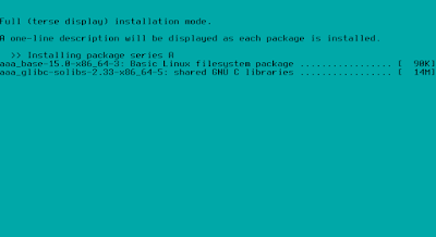 最近の Linux ディストリビューションの多くは、簡単にインストールできるように大部分の設定がお任せでできるようになっていますが、Slackware ではそうでもありません。その最たる部分が、たぶん最初のパーティションの設定でしょう。しかし、パーティションさえ設定してしまえば、あとは、メッセージが英語になっているだけで、そう難しいことではありません。インストール時間も、インストールする PC の性能にもよりますが、30 分かかりませんでした。