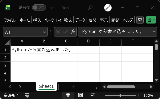 sheet["A1"].value = "Python から書き込みました。" # 値の書き込み